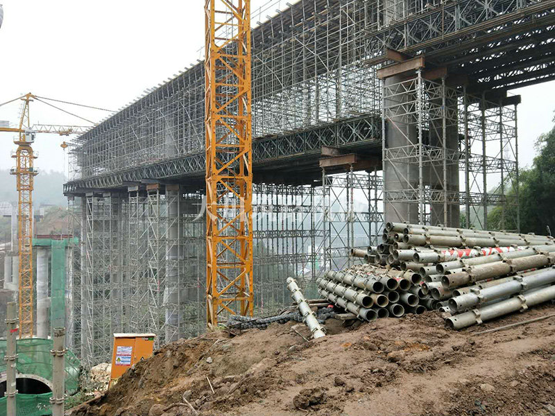 特點:現(xiàn)澆梁支架平臺的跨度大,高度高,使用的貝雷片數(shù)量達到1808片,加強弦桿2800根,工程于2017年9月開始施工。
