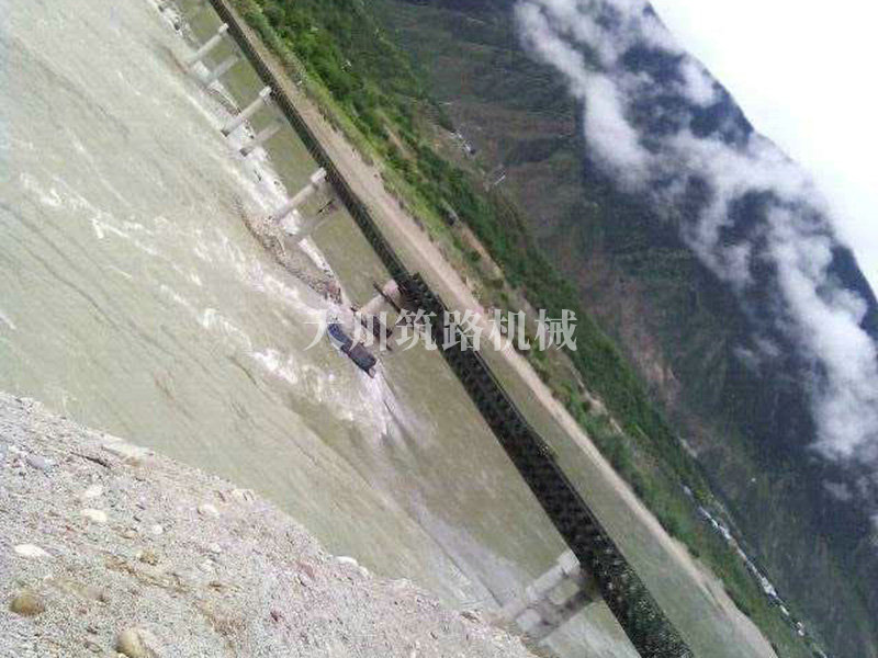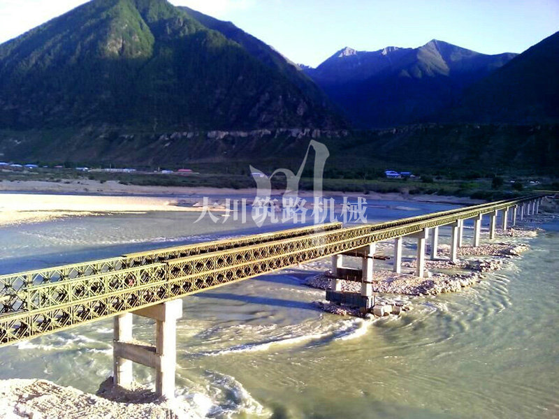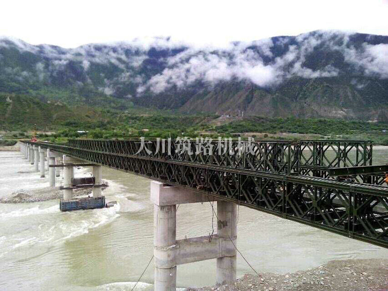 特點:本鋼橋拉薩到林芝鐵路控制性工程的重要組成部分,滿足荷載80T施工車輛通行。主河道水流急,橋墩高,經多方多次論證和設計,最后采用了24+24+24+42+42+24M三排雙層單層混合型加強型雙橫梁下承式鋼橋??朔耸┕るy度大、氧氣較稀薄等因難因素,采用推出法安裝,于2015年6月通車。